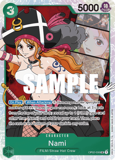 [On Play]/[When Attacking] ? (You may rest the specified number of DON!! cards in your cost area.): Look at 3 cards from the top of your deck; reveal up to 1 {FILM} type card other than [Nami] and add it to your hand. Then, place the rest at the bottom of your deck in any order.