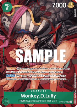 [Blocker] (After your opponent declares an attack, you may rest this card to make it the new target of the attack.) [On Play] Play up to 1 {FILM} or {Straw Hat Crew} type Character card with a cost of 4 or less from your hand.