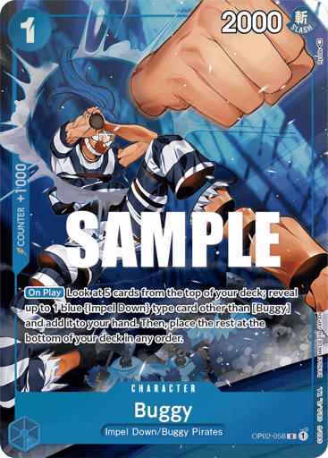 [On Play] Look at 5 cards from the top of your deck; reveal up to 1 blue {Impel Down} type card other than [Buggy] and add it to your hand. Then, place the rest at the bottom of your deck in any order.