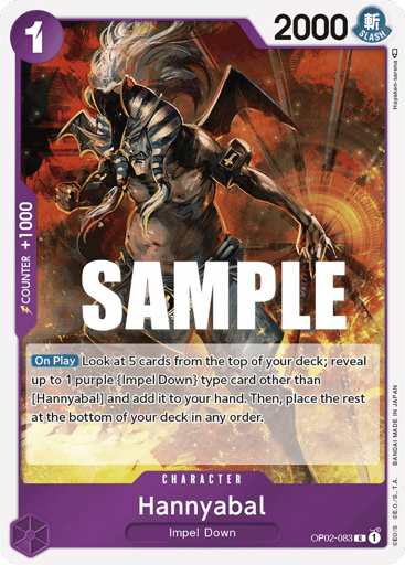 [On Play] Look at 5 cards from the top of your deck; reveal up to 1 purple {Impel Down} type card other than [Hannyabal] and add it to your hand. Then, place the rest at the bottom of your deck in any order.