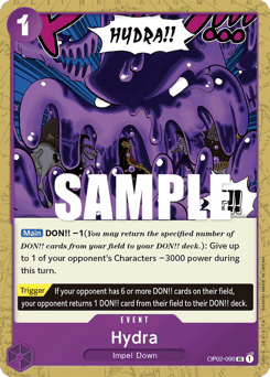 [Main] DON!! ?1 (You may return the specified number of DON!! cards from your field to your DON!! deck.): Give up to 1 of your opponent's Characters ?3000 power during this turn. [Trigger] If your opponent has 6 or more DON!! cards on their field, your opponent returns 1 DON!! card from their field to their DON!! deck.