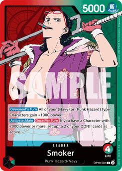 [Opponent's Turn] All of your {Navy} or {Punk Hazard} type Characters gain +1000 power. [Activate: Main] [Once Per Turn] If you have a Character with 7000 power or more, set up to 2 of your DON!! cards as active.