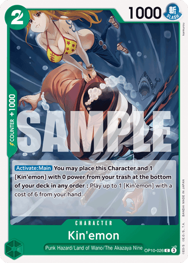 [Activate: Main] You may place this Character and 1 [Kin'emon] with 1000 power from your trash at the bottom of your deck in any order: Play up to 1 [Kin'emon] with a cost of 6 from your hand.