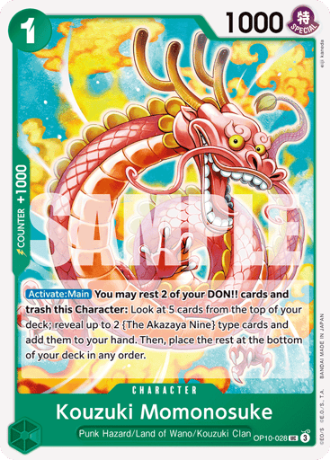 [Activate: Main] You may rest 2 of your DON!! cards and trash this Character: Look at 5 cards from the top of your deck; reveal up to 2 {The Akazaya Nine} type cards and add them to your hand. Then, place the rest at the bottom of your deck in any order.