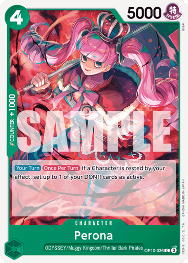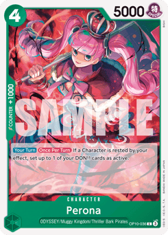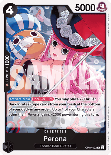 [Activate: Main] [Once Per Turn] You may place 2 {Thriller Bark Pirates} type cards from your trash at the bottom of your deck in any order: Up to 1 of your Characters other than [Perona] gains +2000 power during this turn.