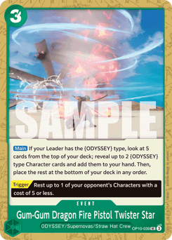 [Main] If your Leader has the {ODYSSEY} type, look at 5 cards from the top of your deck; reveal up to 2 {ODYSSEY} type Character cards and add them to your hand. Then, place the rest at the bottom of your deck in any order. [Trigger] Rest up to 1 of your opponent's Characters with a cost of 5 or less.