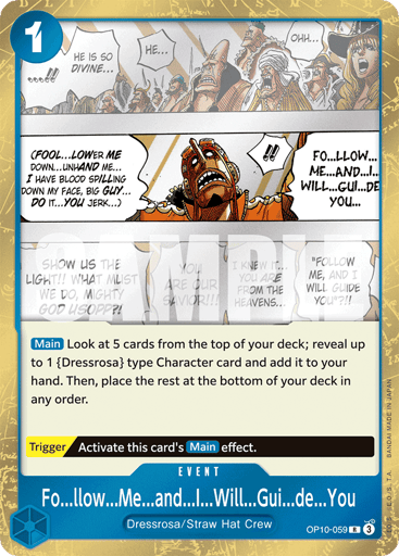 [Main] Look at 5 cards from the top of your deck; reveal up to 1 {Dressrosa} type Character card and add it to your hand. Then, place the rest at the bottom of your deck in any order. [Trigger] Activate this card's [Main] effect.