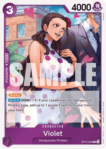 [Blocker] [On K.O.] DON!! −1: If your Leader has the {Donquixote Pirates} type, add up to 1 purple Event from your trash to your hand.