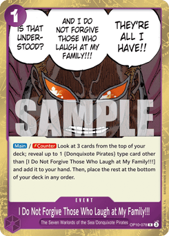 [Main]/[Counter] Look at 3 cards from the top of your deck; reveal up to 1 {Donquixote Pirates} type card other than [I Do Not Forgive Those Who Laugh at My Family!!!] and add it to your hand. Then, place the rest at the bottom of your deck in any order.
