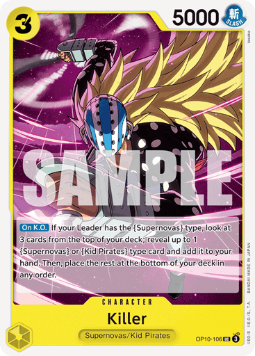 [On K.O.] If your Leader has the {Supernovas} type, look at 3 cards from the top of your deck; reveal up to 1 {Supernovas} or {Kid Pirates} type card and add it to your hand. Then, place the rest at the bottom of your deck in any order.