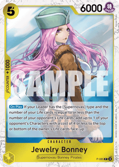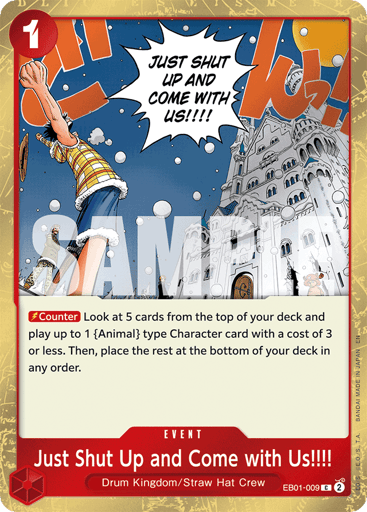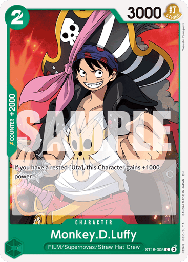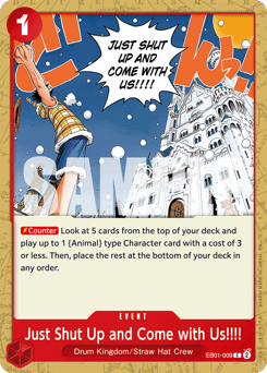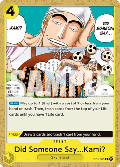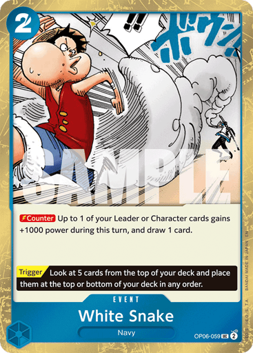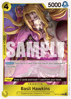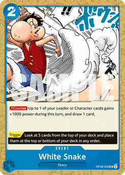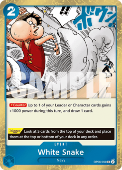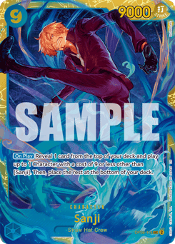 [On Play] Look at 5 cards from the top of your deck; reveal up to 1 {Straw Hat Crew} type card other than [Nami] and add it to your hand. Then, place the rest at the bottom of your deck in any order. [Trigger] Play this card.