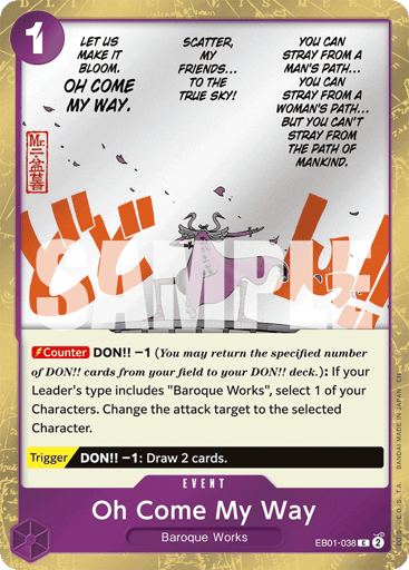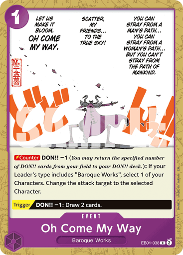 [Counter] DON!! -1 (You may return the specified number of DON!! cards from your field to your DON!! deck.): If your Leader's type includes "Baroque Works", select 1 of your Characters. Change the attack target to the selected Character. [Trigger] DON!! -1: Draw 2 cards.