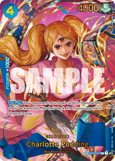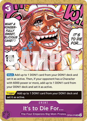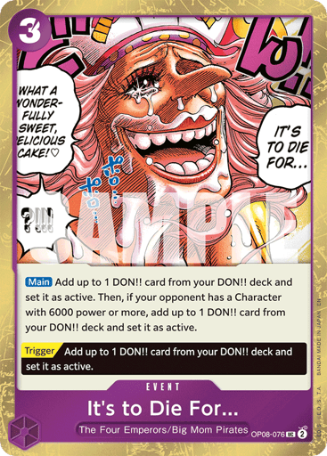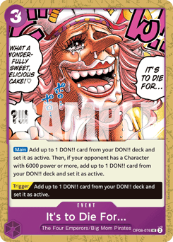 [On Play] DON!! −2: If your Leader has the {Big Mom Pirates} type and your opponent has 6 or more DON!! cards on their field, draw 2 cards. Then, play up to 1 {Big Mom Pirates} type Character card with 6000 to 8000 power from your hand.