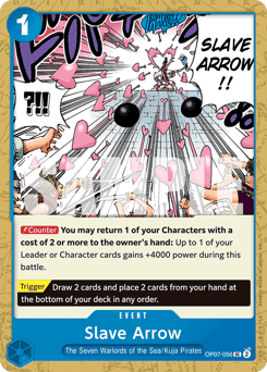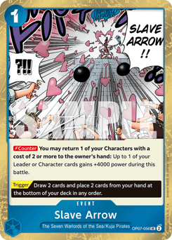[Counter] You may return 1 of your Characters with a cost of 2 or more to the owner's hand: Up to 1 of your Leader or Character cards gains +4000 power during this battle. [Trigger] Draw 2 cards and place 2 cards from your hand at the bottom of your deck in any order.