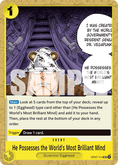 [Main] Look at 5 cards from the top of your deck; reveal up to 1 {Egghead} type card other than [He Possesses the World's Most Brilliant Mind] and add it to your hand. Then, place the rest at the bottom of your deck in any order. [Trigger] Draw 1 card.