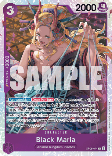 [Activate: Main] [Once Per Turn] If you have no other [Black Maria] Characters, add up to 5 DON!! cards from your DON!! deck and rest them. Then, at the end of this turn, return DON!! cards from your field to your DON!! deck until you have the same number of DON!! cards on your field as your opponent.