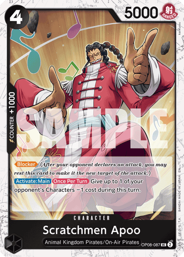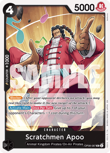 [Blocker] (After your opponent declares an attack, you may rest this card to make it the new target of the attack.) [Activate: Main] [Once Per Turn] Give up to 1 of your opponent's Characters −1 cost during this turn.