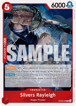 [Blocker] (After your opponent declares an attack, you may rest this card to make it the new target of the attack.) [On Play] If your opponent has 2 or more Characters with a base power of 5000 or more, draw 2 cards and trash 1 card from your hand.