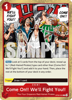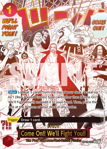 [Main] Look at 5 cards from the top of your deck; reveal up to 1 {Red-Haired Pirates} type card other than [Come On!! We'll Fight You!!] and add it to your hand. Then, place the rest at the bottom of your deck in any order. [Trigger] Draw 1 card.