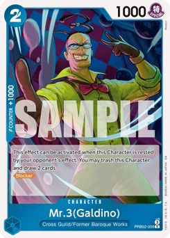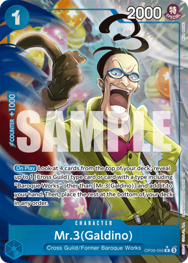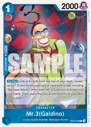 [On Play] Look at 4 cards from the top of your deck; reveal up to 1 {Cross Guild} type card or card with a type including "Baroque Works" other than [Mr.3(Galdino)] and add it to your hand. Then, place the rest at the bottom of your deck in any order.