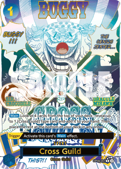 [Main] Look at 4 cards from the top of your deck; reveal up to 1 {Cross Guild} type card and add it to your hand. Then, place the rest at the bottom of your deck in any order. [Trigger] Activate this card's [Main] effect.