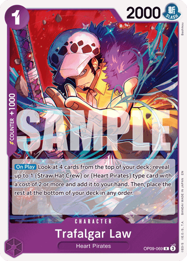 [On Play] Look at 4 cards from the top of your deck; reveal up to 1 {Straw Hat Crew} or {Heart Pirates} type card with a cost of 2 or more and add it to your hand. Then, place the rest at the bottom of your deck in any order.