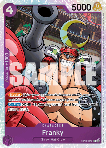 [Blocker] (After your opponent declares an attack, you may rest this card to make it the new target of the attack.) [On Play] DON!! −2, You may trash 1 card from your hand: Draw 2 cards.