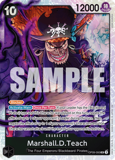 [Blocker] [Activate: Main] [Once Per Turn] If your Leader has the {Blackbeard Pirates} type and this Character was played on this turn, negate the effect of up to 1 of your opponent's Leader during this turn. Then, negate the effect of up to 1 of your opponent's Characters and that Character cannot attack until the end of your opponent's next turn.