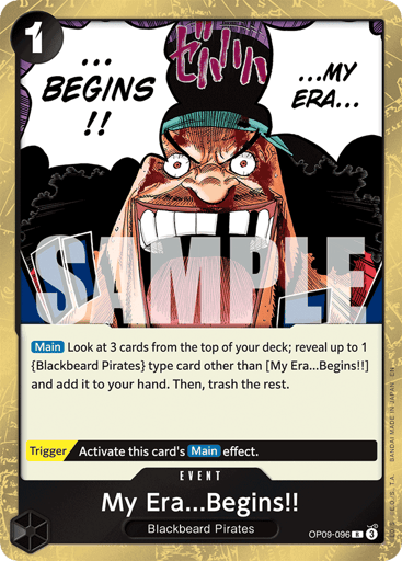 [Main] Look at 3 cards from the top of your deck; reveal up to 1 {Blackbeard Pirates} type card other than [My Era...Begins!!] and add it to your hand. Then, trash the rest. [Trigger] Activate this card's [Main] effect.
