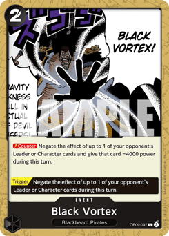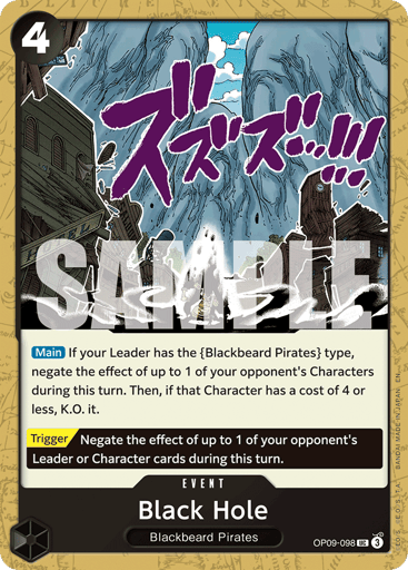 [Main] If your Leader has the {Blackbeard Pirates} type, negate the effect of up to 1 of your opponent's Characters during this turn. Then, if that Character has a cost of 4 or less, K.O. it. [Trigger] Negate the effect of up to 1 of your opponent's Leader or Character cards during this turn.