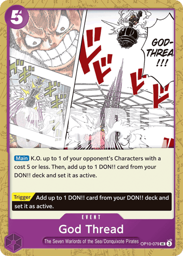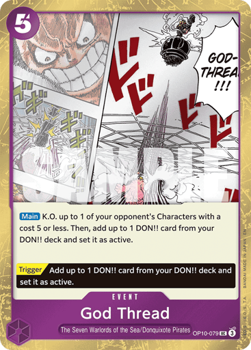 [Main] K.O. up to 1 of your opponent's Characters with a cost 5 or less. Then, add up to 1 DON!! card from your DON!! deck and set it as active. [Trigger] Add up to 1 DON!! card from your DON!! deck and set it as active.