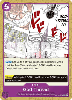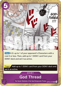 [On Play] Give up to 1 rested DON!! card to your Leader or 1 of your Characters. [Activate: Main] You may rest this Character: K.O. up to 1 of your opponent's Characters with 5000 power or less.