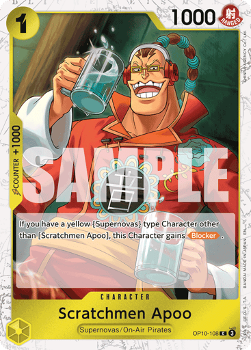 If you have a yellow {Supernovas} type Character other than [Scratchmen Apoo], this Character gains [Blocker].