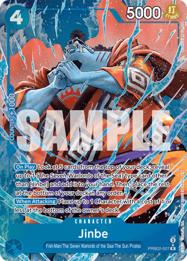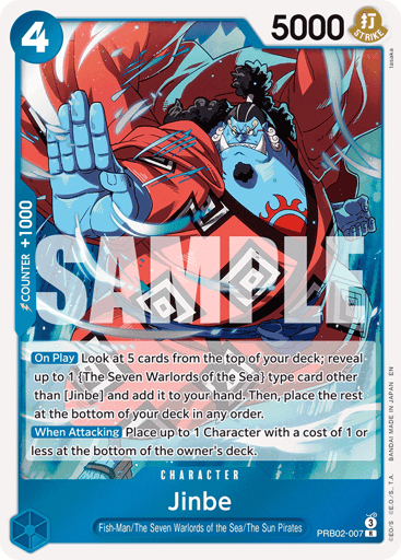 [On Play] Look at 5 cards from the top of your deck; reveal up to 1 {The Seven Warlords of the Sea} type card other than [Jinbe] and add it to your hand. Then, place the rest at the bottom of your deck in any order. [When Attacking] Place up to 1 Character with a cost of 1 or less at the bottom of the owner's deck.