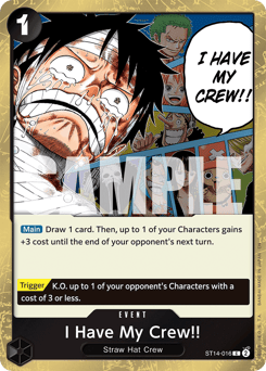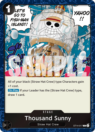 All of your black {Straw Hat Crew} type Characters gain +1 cost. [On Play] If your Leader has the {Straw Hat Crew} type, draw 1 card.