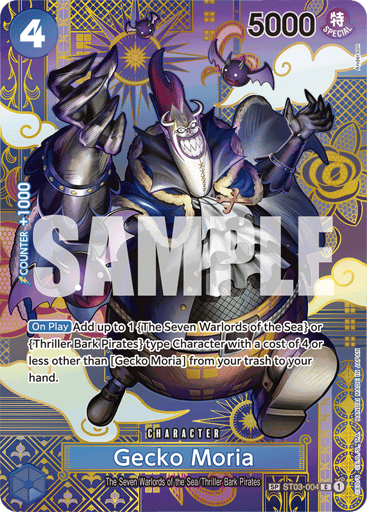 [On Play] Add up to 1 {The Seven Warlords of the Sea} or {Thriller Bark Pirates} type Character with a cost of 4 or less other than [Gecko Moria] from your trash to your hand.