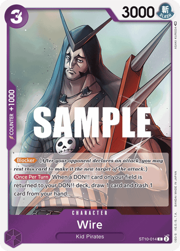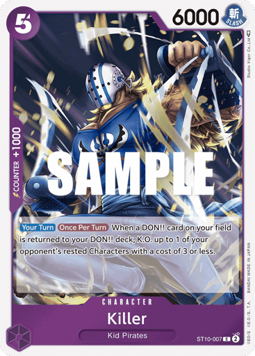 [Rush] (This card can attack on the turn in which it is played.) [Once Per Turn] When your opponent activates a [Blocker], K.O. up to 1 of your opponent's Characters with 8000 power or less.