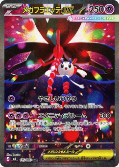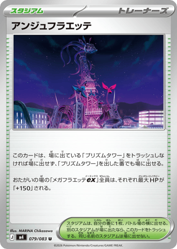 このカードは、場に出ている「プリズムタワー」をトラッシュしなければ場に出せず、「プリズムタワー」を出した番でも場に出せる。 おたがいの場の「メガフラエッテex」全員は、それぞれ最大HPが「+150」される。 スタジアムは、自分の番に1枚だけ、バトル場の横に出せる。別の名前のスタジアムが場に出たなら、このカードをトラッシュする。