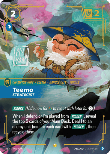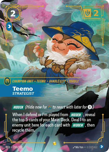 [Hidden] (Hide now for {RR} to react with later for {0}.) When I defend or I'm played from [Hidden], reveal the top 5 cards of your Main Deck. Deal 1 to an enemy unit here for each card with [Hidden], then recycle them.