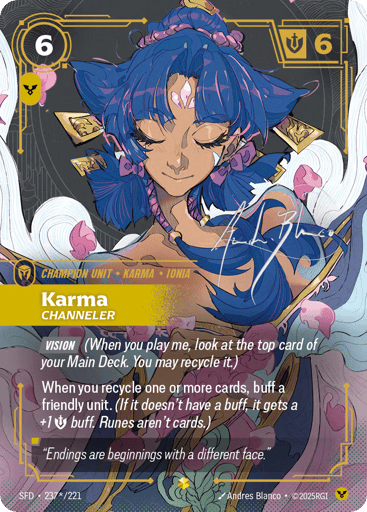 [Vision] (When you play me, look at the top card of your Main Deck. You may recycle it.) When you recycle one or more cards, buff a friendly unit. (If it doesn't have a buff, it gets a +1 {M} buff. Runes aren't cards.)