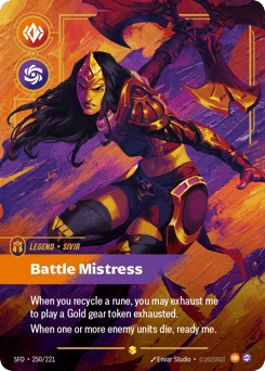 When you recycle a rune, you may exhaust me to play a Gold gear token exhausted. When one or more enemy units die, ready me.